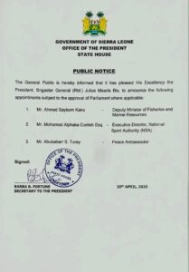 This latest appointment forms part of a series of key nominations by President Bio, which also include Mr. Ahmed Saybom Kanu as Deputy Minister of Fisheries and Marine Resources, and Mr. Mohamed Alphaka Conteh Esq. as Executive Director of the National Sports Authority (NSA).