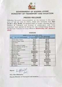 Freetown, Sierra Leone – January 30, 2026 – In response to the recent hike in fuel prices, the Government of Sierra Leone’s Ministry of Transport and Aviation has announced a 14% increase in sea transport fares for ferries operating between Freetown and Lungi.