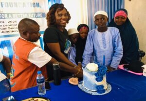 The CEO, Zainab Denton cuting cake with cross section of the Ophan from the Sabiquoun Orphanage Home.